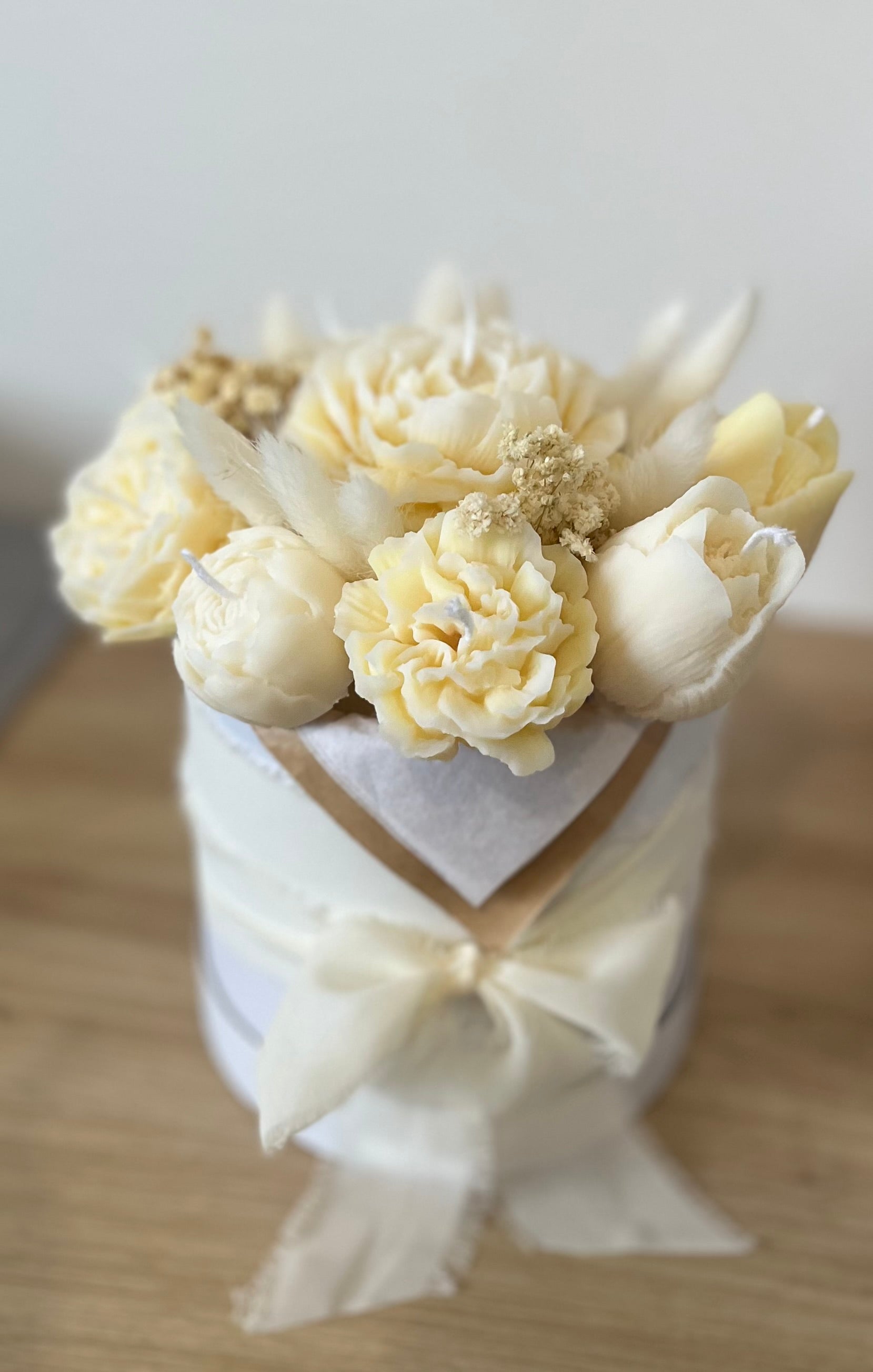 La compo' de Louise est composé d'une dizaine de bougies en forme de fleurs, parfumées à la douce odeur: Fleur de coton, présentées dans un joli pot rond orné d'un ruban.