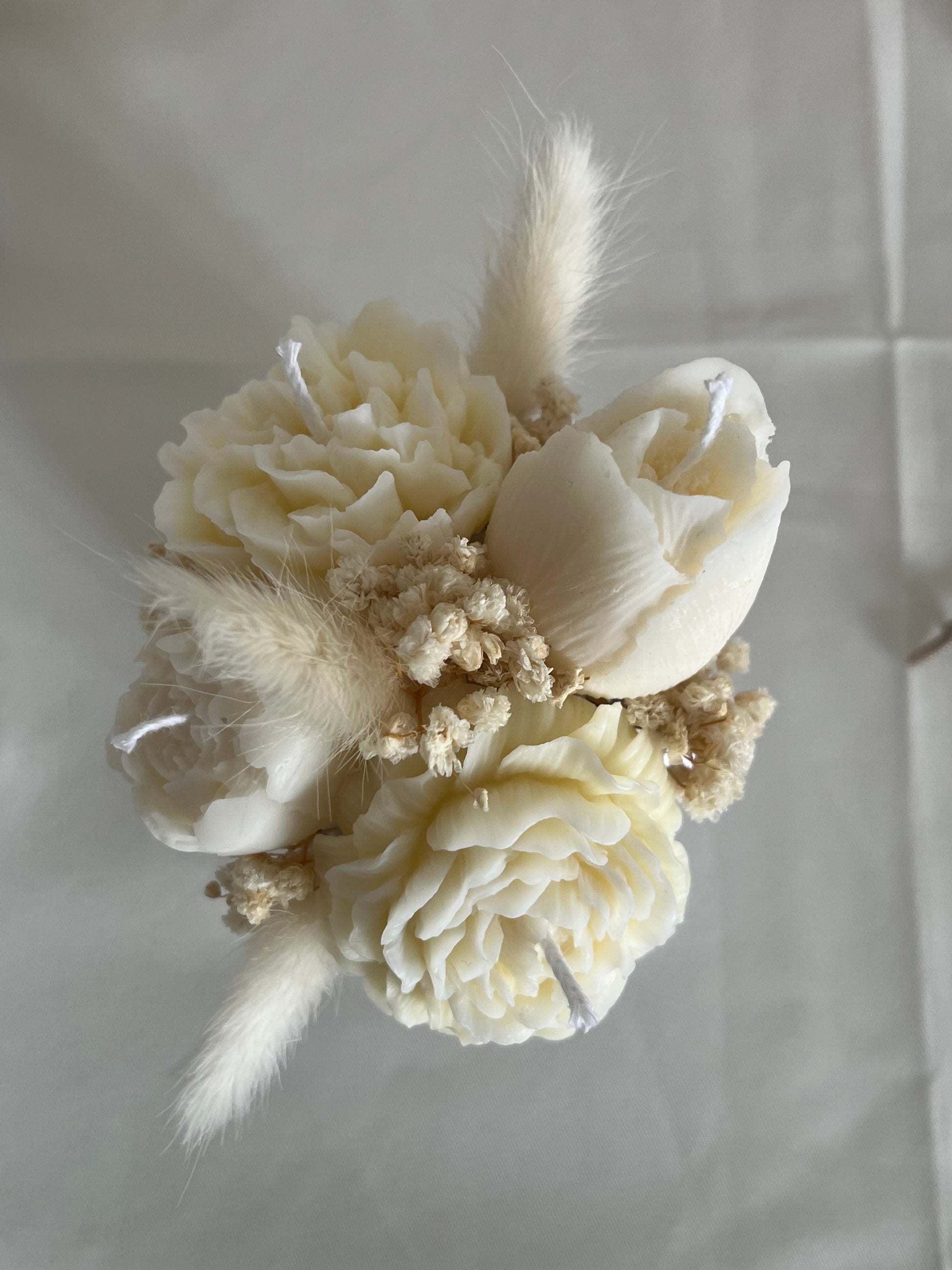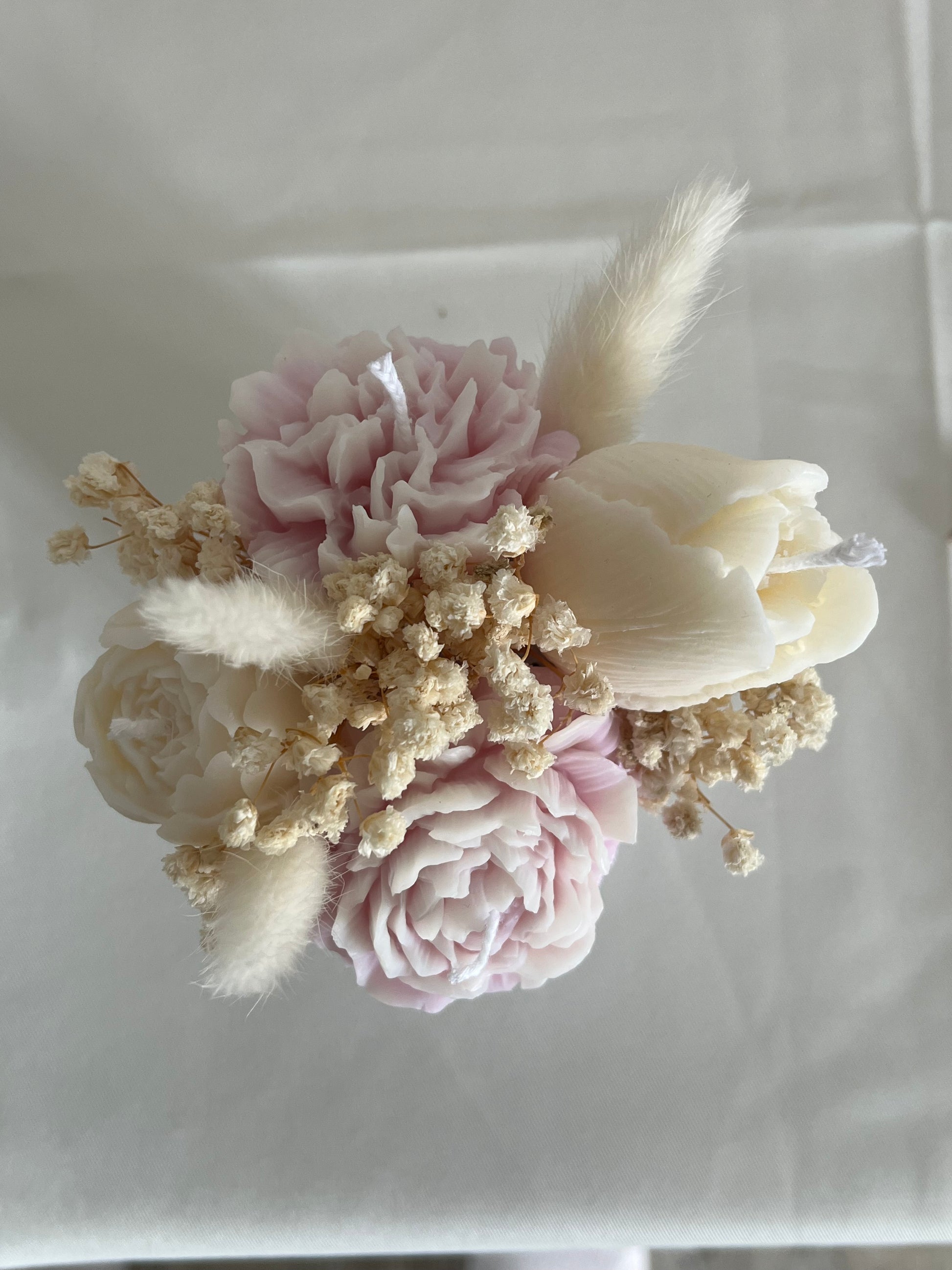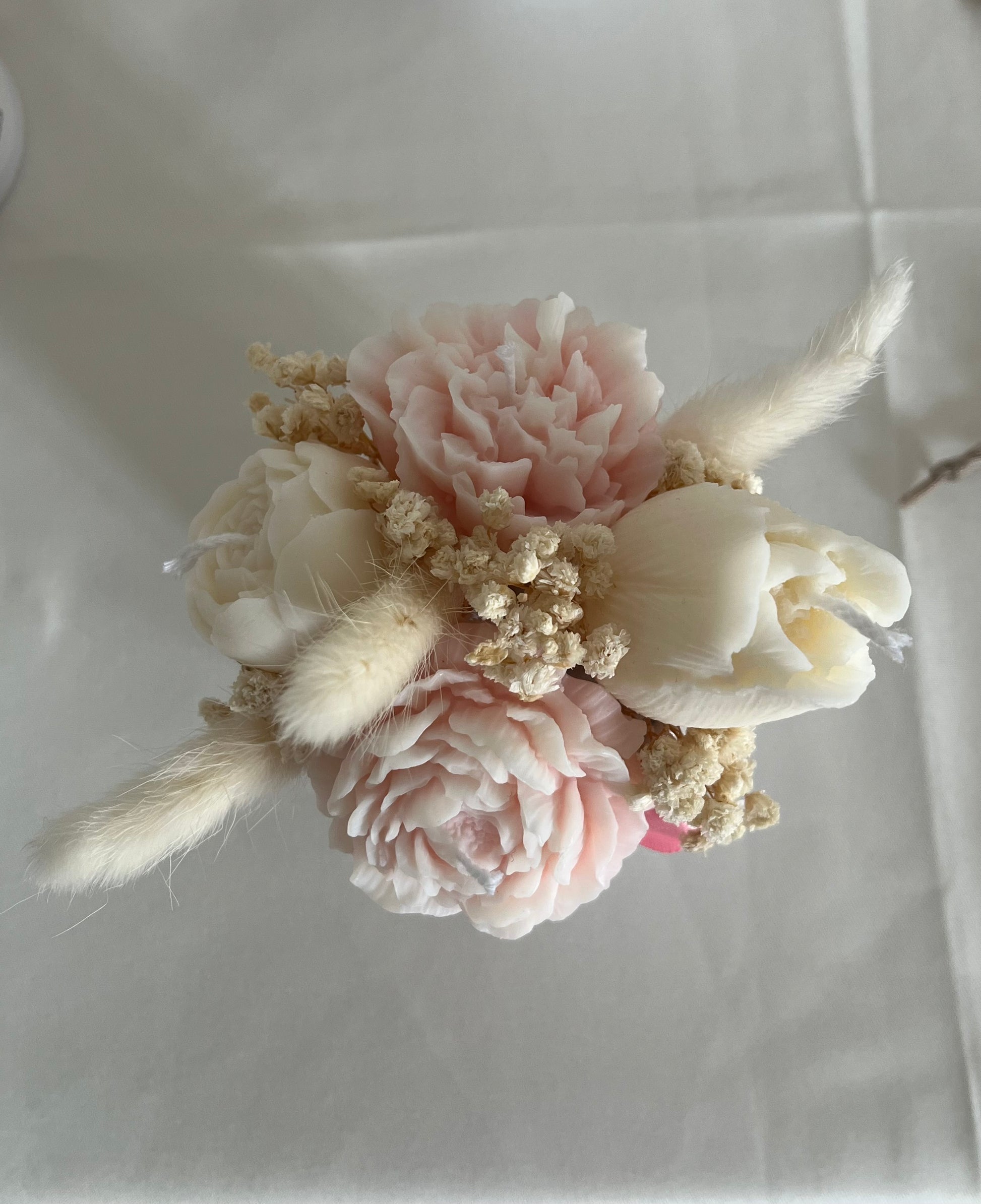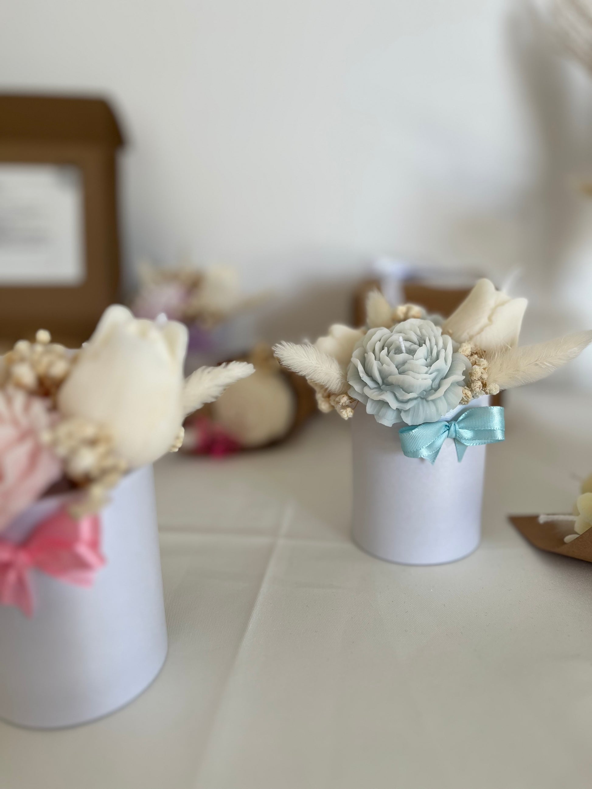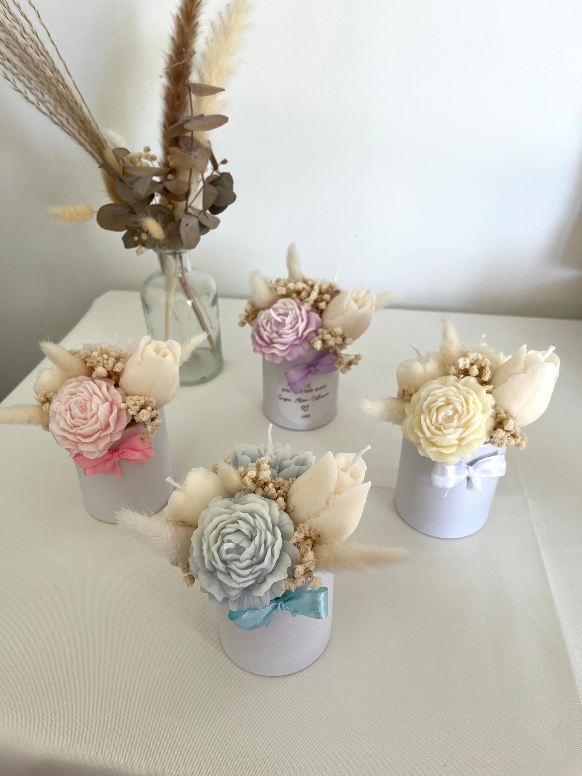 La mini compo' est une jolie création floral en cire végétale parfumée à la fleur de coton, déclinée en quatre coloris tendres: bleu, rose, violet et jaune.