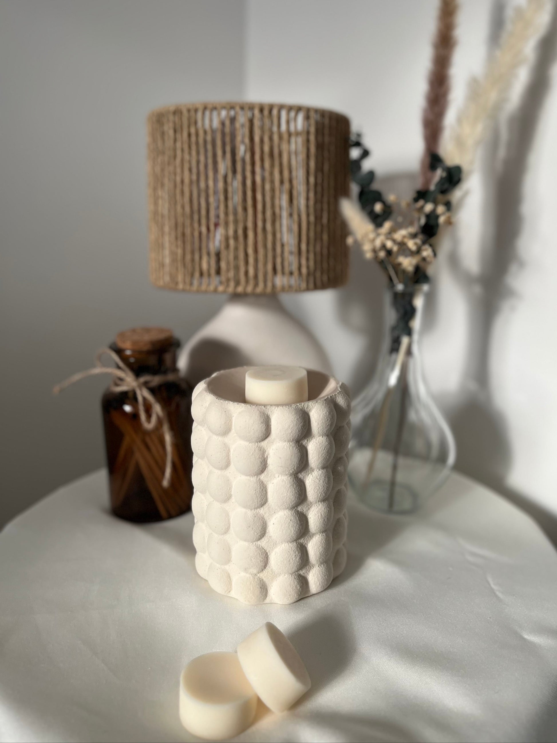 Découvrez nos nouveaux brûle-parfums en dolomite texturée , des pièces raffinées qui allient douceur et modernité. Leur design épuré s'intègre parfaitement à toutes les décorations, apportant une touche de sérénité à votre intérieur. Conçus pour sublimer la diffusion de vos fondants parfumés préférés, ils créent une ambiance chaleureuse et apaisante en un instant.