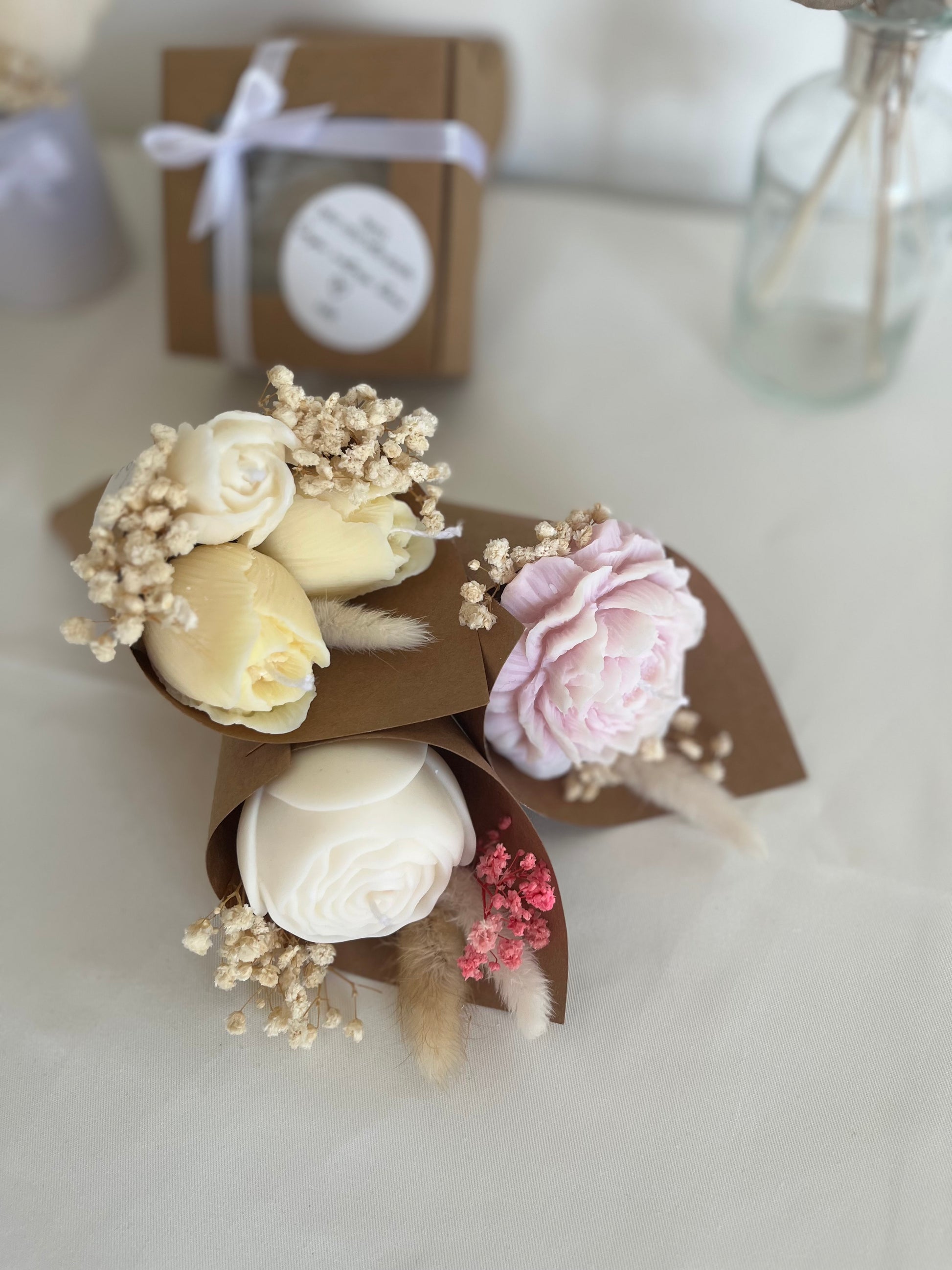 Ces minis bouquets en cire végétale parfumée sont de véritables bijoux à offrir. Chaque composition est réalisée avec soin à la main, et accompagnée de fleurs séchées pour une touche naturelle et poétique. Délicatement parfumé à la fleur de coton, ils diffusent une senteur douce, fraîche et enveloppante.