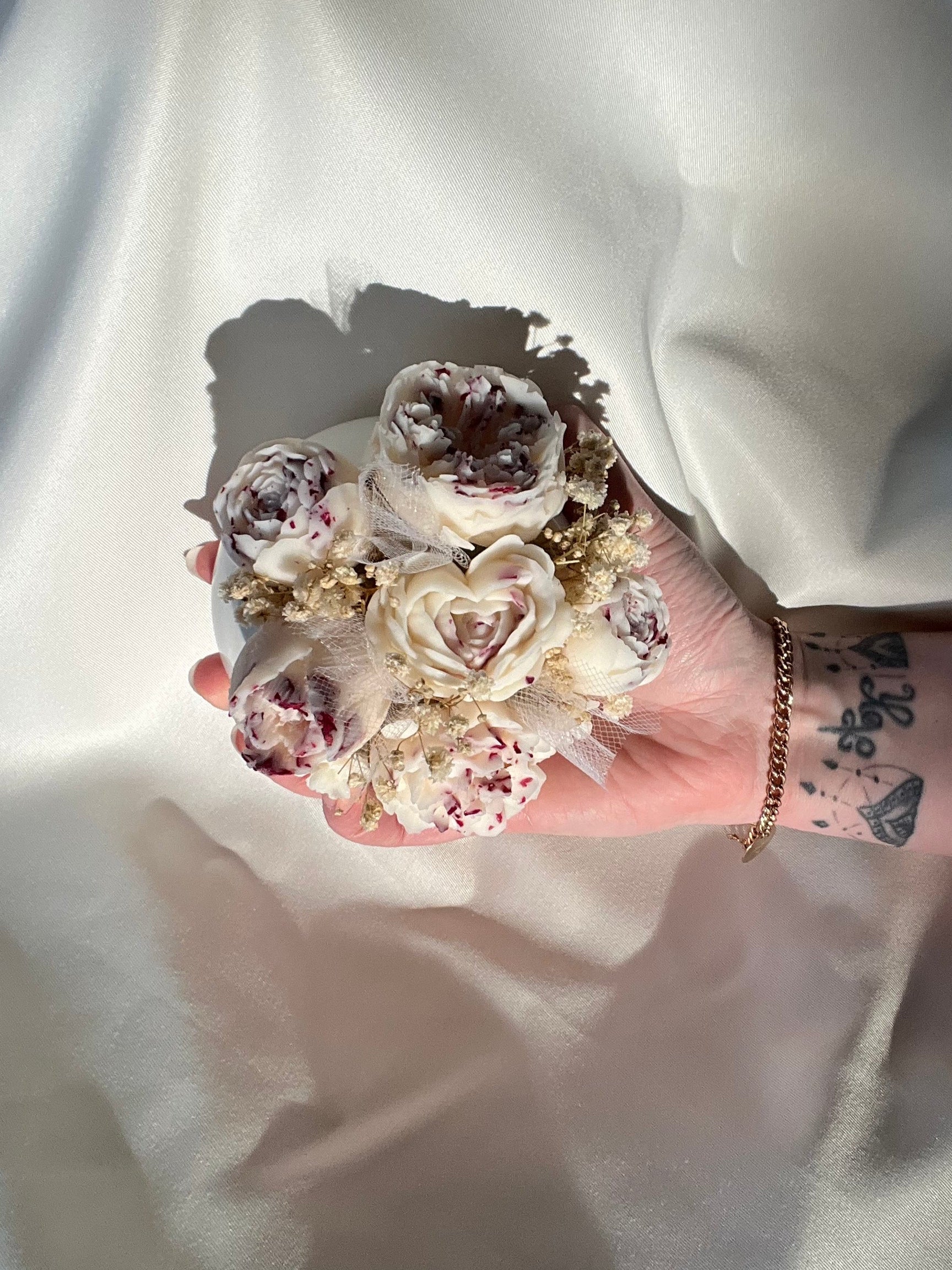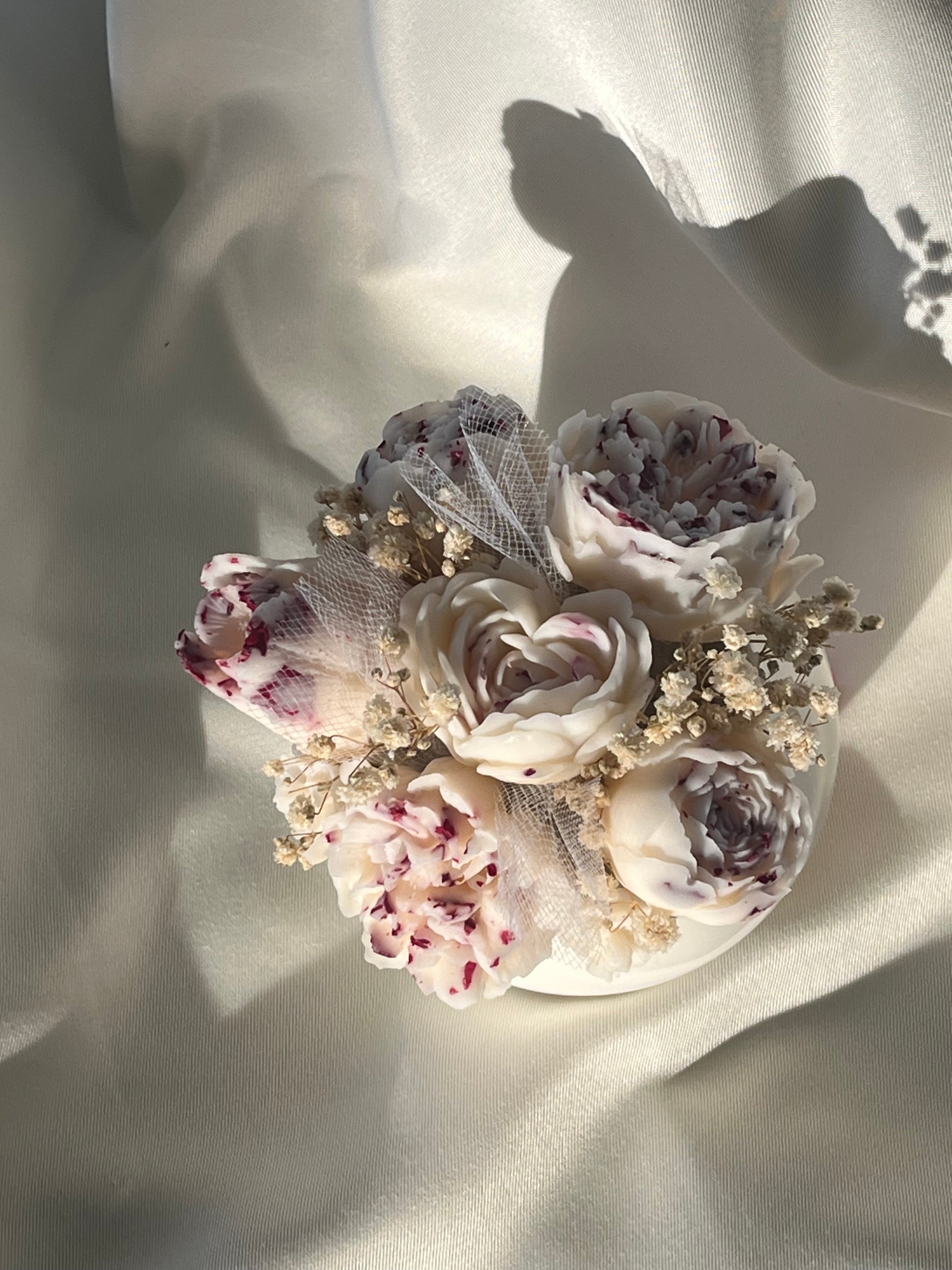 Ravissant petit bouquet de fondants , subtilement parfumé à l'envoûtante senteur de Fleur de Coton et imprégné de véritables pétales de rose séchés.
